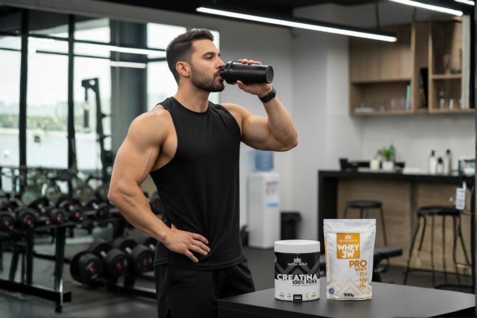 A creatina ainda aumenta volume e hidratação muscular, enquanto o whey ajuda a transformar esses estímulos em hipertrofia real.